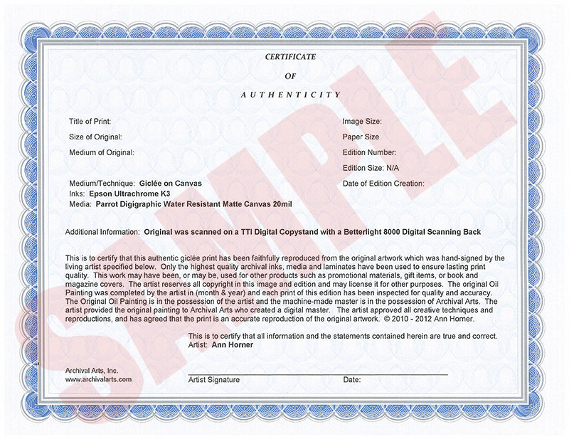 Each print will be accompanied by a Certificate of Authenticity signed by me, the Artist. The law of various states, including California and New York, provides for the disclosure in writing of certain information concerning prints, photographs, and sculpture casts. This information is available to you, and you may request to see it prior to the purchase, or link here (view attachment) to review a sample Certificate of Authenticity which describes the types of information you will be provided with any purchased print.